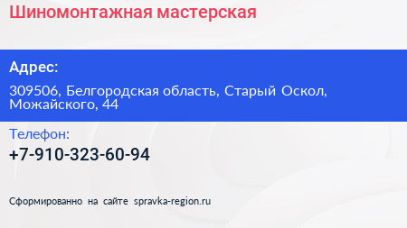 Шиномонтажная мастерская по адресу 309506, Белгородская область, Старый Оскол, Можайского, 44 в дальнейшем Организация, размещена в следующих категориях: