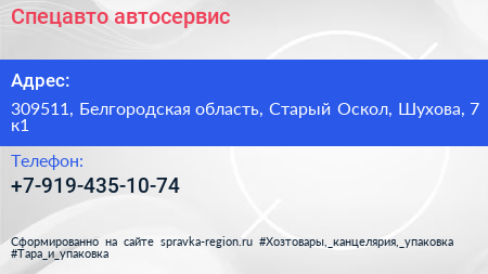 Спецавто, автосервис по адресу 309511, Белгородская область, Старый Оскол, Шухова, 7 к1 в дальнейшем Организация, размещена в следующих категориях: