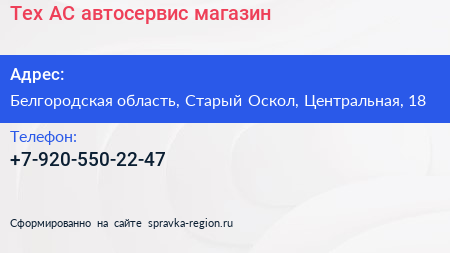 Тех-АС, автосервис-магазин по адресу Белгородская область, Старый Оскол, Центральная, 18 в дальнейшем Организация, размещена в следующих категориях: