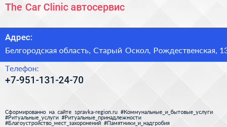 The Car Clinic, автосервис по адресу Белгородская область, Старый Оскол, Рождественская, 13 в дальнейшем Организация, размещена в следующих категориях: