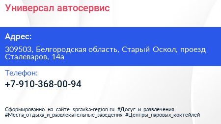 Универсал, автосервис по адресу 309503, Белгородская область, Старый Оскол, проезд Сталеваров, 14а в дальнейшем Организация, размещена в следующих категориях: