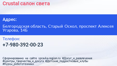 Crustal, салон света по адресу Белгородская область, Старый Оскол, проспект Алексея Угарова, 14Б в дальнейшем Организация, размещена в следующих категориях: