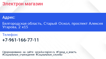 Электрон, магазин по адресу Белгородская область, Старый Оскол, проспект Алексея Угарова, 2 к15 в дальнейшем Организация, размещена в следующих категориях: