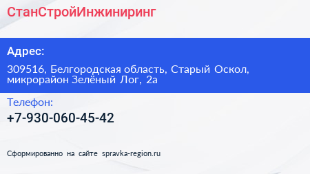 СтанСтройИнжиниринг по адресу 309516, Белгородская область, Старый Оскол, микрорайон Зелёный Лог, 2а в дальнейшем Организация, размещена в следующих категориях: