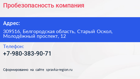 Пробезопасность, компания по адресу 309516, Белгородская область, Старый Оскол, Молодёжный проспект, 12 в дальнейшем Организация, размещена в следующих категориях: