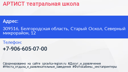 АРТИСТ, театральная школа по адресу 309516, Белгородская область, Старый Оскол, Северный микрорайон, 12 в дальнейшем Организация, размещена в следующих категориях: