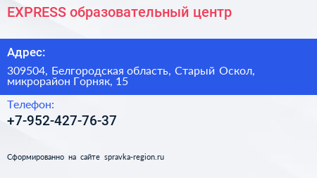 EXPRESS, образовательный центр по адресу 309504, Белгородская область, Старый Оскол, микрорайон Горняк, 15 в дальнейшем Организация, размещена в следующих категориях: