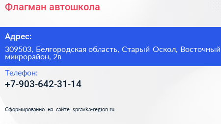 Флагман, автошкола по адресу 309503, Белгородская область, Старый Оскол, Восточный микрорайон, 2в в дальнейшем Организация, размещена в следующих категориях: