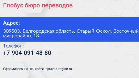 Глобус, бюро переводов по адресу 309503, Белгородская область, Старый Оскол, Восточный микрорайон, 18 в дальнейшем Организация, размещена в следующих категориях: