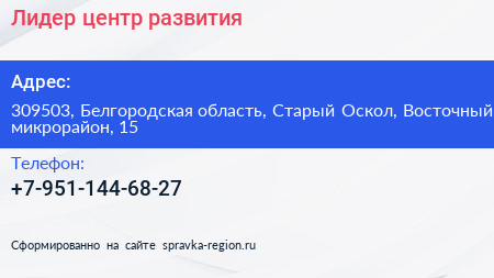 Лидер, центр развития по адресу 309503, Белгородская область, Старый Оскол, Восточный микрорайон, 15 в дальнейшем Организация, размещена в следующих категориях: