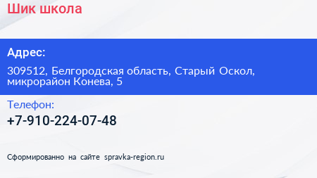 Шик, школа по адресу 309512, Белгородская область, Старый Оскол, микрорайон Конева, 5 в дальнейшем Организация, размещена в следующих категориях: