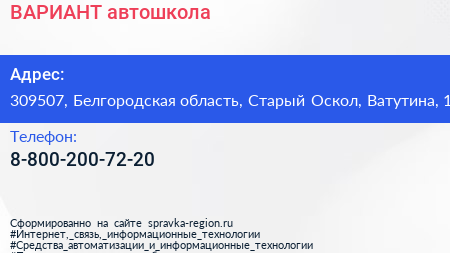 ВАРИАНТ, автошкола по адресу 309507, Белгородская область, Старый Оскол, Ватутина, 1 в дальнейшем Организация, размещена в следующих категориях: