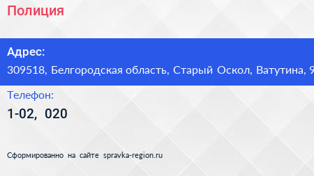 Полиция по адресу 309518, Белгородская область, Старый Оскол, Ватутина, 9 в дальнейшем Организация, размещена в следующих категориях: