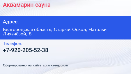 Аквамарин, сауна по адресу Белгородская область, Старый Оскол, Натальи Лихачёвой, 8 в дальнейшем Организация, размещена в следующих категориях: