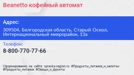 Beanetto, кофейный автомат по адресу 309504, Белгородская область, Старый Оскол, Интернациональный микрорайон, 13а в дальнейшем Организация, размещена в следующих категориях: