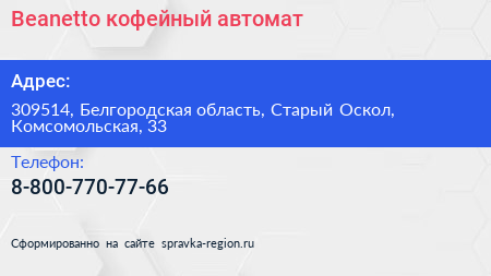Beanetto, кофейный автомат по адресу 309514, Белгородская область, Старый Оскол, Комсомольская, 33 в дальнейшем Организация, размещена в следующих категориях: