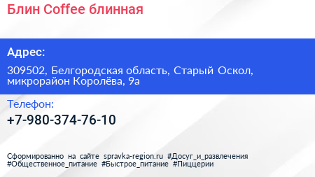 Блин & Coffee, блинная по адресу 309502, Белгородская область, Старый Оскол, микрорайон Королёва, 9а в дальнейшем Организация, размещена в следующих категориях: