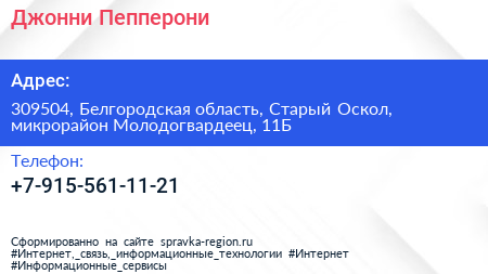 Джонни Пепперони по адресу 309504, Белгородская область, Старый Оскол, микрорайон Молодогвардеец, 11Б в дальнейшем Организация, размещена в следующих категориях: