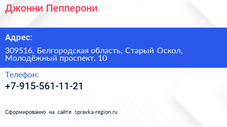 Джонни Пепперони по адресу 309516, Белгородская область, Старый Оскол, Молодёжный проспект, 10 в дальнейшем Организация, размещена в следующих категориях:
