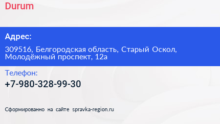 Durum по адресу 309516, Белгородская область, Старый Оскол, Молодёжный проспект, 12а в дальнейшем Организация, размещена в следующих категориях: