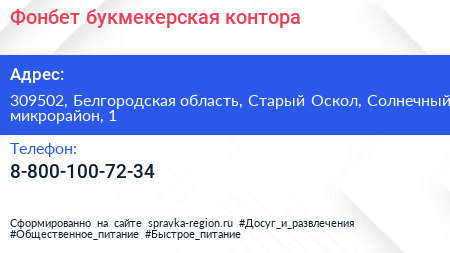 Фонбет, букмекерская контора по адресу 309502, Белгородская область, Старый Оскол, Солнечный микрорайон, 1 в дальнейшем Организация, размещена в следующих категориях: