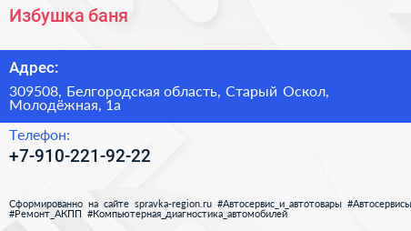 Избушка, баня по адресу 309508, Белгородская область, Старый Оскол, Молодёжная, 1а в дальнейшем Организация, размещена в следующих категориях: