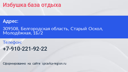 Избушка, база отдыха по адресу 309508, Белгородская область, Старый Оскол, Молодёжная, 1Б/2 в дальнейшем Организация, размещена в следующих категориях: