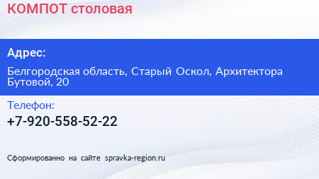 КОМПОТ, столовая по адресу Белгородская область, Старый Оскол, Архитектора Бутовой, 20 в дальнейшем Организация, размещена в следующих категориях: