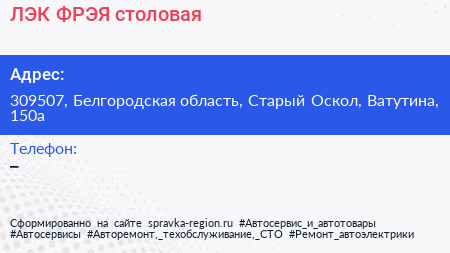 ЛЭК ФРЭЯ, столовая по адресу 309507, Белгородская область, Старый Оскол, Ватутина, 150а в дальнейшем Организация, размещена в следующих категориях: