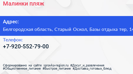 Малинки, пляж по адресу Белгородская область, Старый Оскол, Базы отдыха тер, 14 в дальнейшем Организация, размещена в следующих категориях: