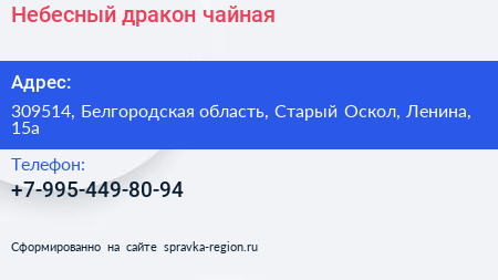 Небесный дракон, чайная по адресу 309514, Белгородская область, Старый Оскол, Ленина, 15а в дальнейшем Организация, размещена в следующих категориях: