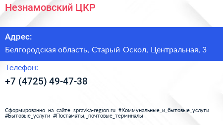 Незнамовский ЦКР по адресу Белгородская область, Старый Оскол, Центральная, 3 в дальнейшем Организация, размещена в следующих категориях: