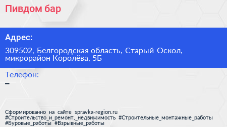 Пивдом, бар по адресу 309502, Белгородская область, Старый Оскол, микрорайон Королёва, 5Б в дальнейшем Организация, размещена в следующих категориях: