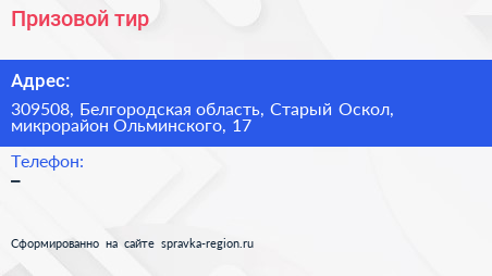 Призовой, тир по адресу 309508, Белгородская область, Старый Оскол, микрорайон Ольминского, 17 в дальнейшем Организация, размещена в следующих категориях: