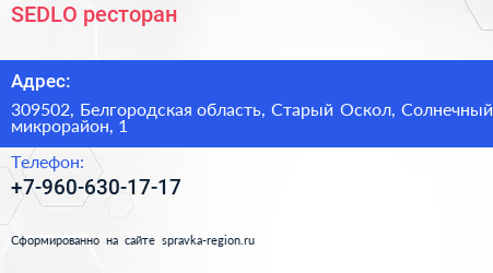 SEDLO, ресторан по адресу 309502, Белгородская область, Старый Оскол, Солнечный микрорайон, 1 в дальнейшем Организация, размещена в следующих категориях: