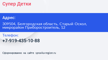 Супер Детки по адресу 309504, Белгородская область, Старый Оскол, микрорайон Приборостроитель, 12 в дальнейшем Организация, размещена в следующих категориях: