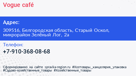 Vogue café по адресу 309516, Белгородская область, Старый Оскол, микрорайон Зелёный Лог, 2а в дальнейшем Организация, размещена в следующих категориях: