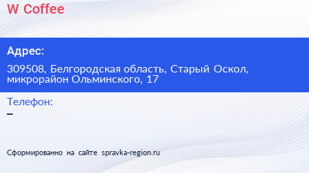 W-Coffee по адресу 309508, Белгородская область, Старый Оскол, микрорайон Ольминского, 17 в дальнейшем Организация, размещена в следующих категориях: