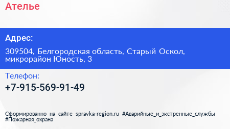 Ателье по адресу 309504, Белгородская область, Старый Оскол, микрорайон Юность, 3 в дальнейшем Организация, размещена в следующих категориях: