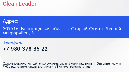 Clean Leader по адресу 309516, Белгородская область, Старый Оскол, Лесной микрорайон, 3 в дальнейшем Организация, размещена в следующих категориях: