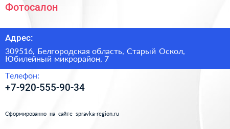 Фотосалон по адресу 309516, Белгородская область, Старый Оскол, Юбилейный микрорайон, 7 в дальнейшем Организация, размещена в следующих категориях:
