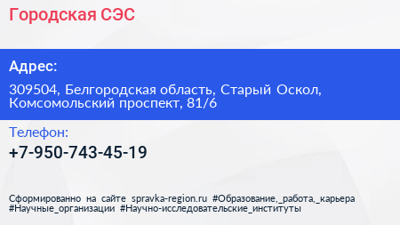 Городская СЭС по адресу 309504, Белгородская область, Старый Оскол, Комсомольский проспект, 81/6 в дальнейшем Организация, размещена в следующих категориях: