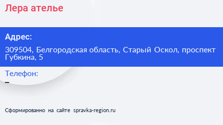 Лера, ателье по адресу 309504, Белгородская область, Старый Оскол, проспект Губкина, 5 в дальнейшем Организация, размещена в следующих категориях: