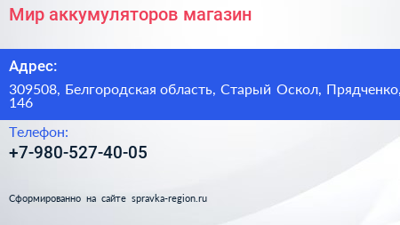 Мир аккумуляторов, магазин по адресу 309508, Белгородская область, Старый Оскол, Прядченко, 146 в дальнейшем Организация, размещена в следующих категориях: