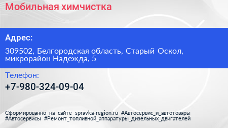 Мобильная химчистка по адресу 309502, Белгородская область, Старый Оскол, микрорайон Надежда, 5 в дальнейшем Организация, размещена в следующих категориях: