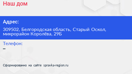 Наш дом по адресу 309502, Белгородская область, Старый Оскол, микрорайон Королёва, 29Б в дальнейшем Организация, размещена в следующих категориях: