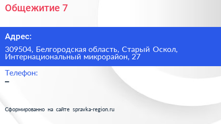 Общежитие №7 по адресу 309504, Белгородская область, Старый Оскол, Интернациональный микрорайон, 27 в дальнейшем Организация, размещена в следующих категориях:
