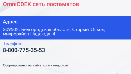 OmniCDEK, сеть постаматов по адресу 309502, Белгородская область, Старый Оскол, микрорайон Надежда, 4 в дальнейшем Организация, размещена в следующих категориях:
