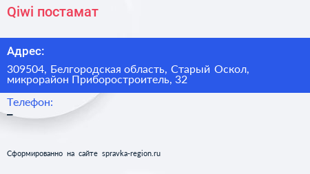 Qiwi, постамат по адресу 309504, Белгородская область, Старый Оскол, микрорайон Приборостроитель, 32 в дальнейшем Организация, размещена в следующих категориях: