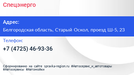 Спецэнерго по адресу Белгородская область, Старый Оскол, проезд Ш-5, 23 в дальнейшем Организация, размещена в следующих категориях: